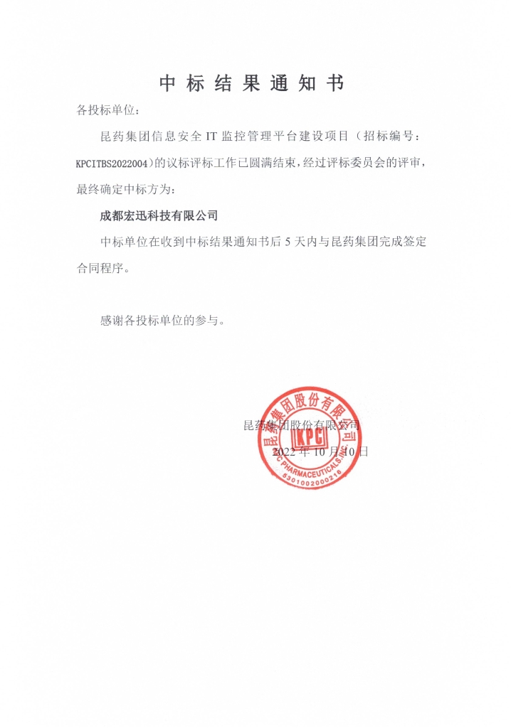<span class="bdsharebuttonbox" data-tag="share_3" data-sharetitle="中标结果公示(昆药集团信息安全IT监控管理平台建设项目)"><a href="#" class="bds_sqq" data-cmd="sqq" title="分享到QQ好友"></a><a href="#" class="bds_weixin" data-cmd="weixin" title="分享到微信"></a><a href="#" class="bds_qzone" data-cmd="qzone" title="分享到QQ空间"></a><a href="#" class="bds_tsina" data-cmd="tsina" title="分享到新浪微博"></a><a href="#" class="bds_more" data-cmd="more"></a></span> 中标结果公示(昆药集团信息安全IT监控管理平台建设项目) <span><i class="ico-1"></i>2022-10-10</span><span class="views"><i class="ico-1"></i><b id="viewCountId"></b></span><span id="switcher"> <a href="javascript:void(0)" id="big"><i class="ico-1"></i></a> <a href="javascript:void(0)"><i class="ico-1"></i></a> <a href="javascript:void(0)" id="small"><i class="ico-1"></i></a> </span> 上一条中标结果公示(昆药集团2022年冷水机组维保项目) 下一条中标结果公示(昆药健康白云机场店装修项目)