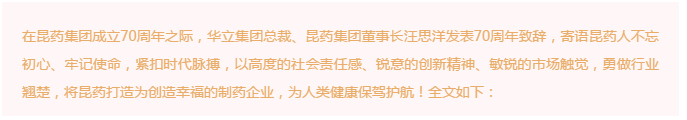 几番风雨洗征程,回眸但见满眼春。70年峥嵘岁月,我们筚路蓝缕、砥砺前行;70年风雨兼程,我们不忘初心、传承精华。重温昆药70年的历史,一幅波澜壮阔的奋斗画卷徐徐铺展开来,一代代昆药人敢为人先的创新精神、笃定前行的坚守精神,为昆药发展注入源源不断的动力。在此,我代表华立集团向70年来为公司发展做出卓越贡献的老领导、老模范、老员工,表示崇高的敬意!向长期以来关心支持公司发展的各级政府领导、合作伙伴和社会各界朋友们表示衷心的感谢!