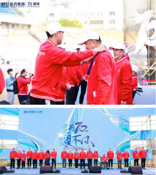 10位昆药老一辈奋斗者代表上台,10位昆药95新生代为他们佩戴上饱含敬意和感恩的70周年致敬勋章。一代代昆药人开创了昆药的先河,一代代昆药人继承了昆药事业并使之发扬光大,新一代昆药人肩负着新使命,携手开拓新时代的新征程!